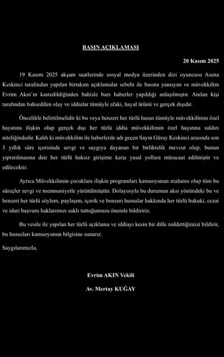 Ancak Evrim Akın, sessizliğini bozmadı; yerine avukatı Mertay Kuğay’ı devreye soktu. Bugün öğle saatlerinde kamuoyuna sunulan resmi açıklamada, iddialar “afaki, hayal ürünü ve tamamen gerçek dışı” olarak damgalandı. Kuğay’ın metninde şu satırlar dikkat çekici: “Müvekkilimle Güray Keskinci arasında son üç yıldır sevgi ve saygıya dayalı bir ilişki var. Bu birlikteliği yıpratmaya yönelik her girişim yasal yollarla engellenecek. Akın’ın yıllardır çocuk programlarında sevgiyle anılmasına rağmen, bu tür asılsız ithamlar özel hayata saldırı niteliğinde. Hukuki, cezai ve idari tüm haklarımızı saklı tutuyoruz; iddiaları kesin bir dille reddediyoruz.”