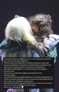 İyi ki benim ablamsın, iyi ki Ahmet’in annesi sensin. Bu acıya bu metanetle dayanabilecek çok az insan var. Mücadelenin önünde saygıyla eğiliyorum, seni çok seviyorum. Yavruna ve sana verdiğim sözü tutacağım; ölene dek yanındayım.”