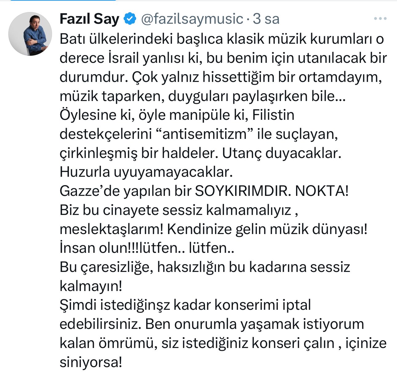 Fazıl Say, sosyal medya üzerinden paylaştığı mesajında, “Gazze’de yapılan bir soykırımdır, nokta! Bu cinayete sessiz kalmamalıyız meslektaşlarım. Kendinize gelin müzik dünyası, insan olun!” sözleriyle müzik dünyasını ve kamuoyunu harekete geçmeye çağırdı. Say, açıklamasında kişisel ve profesyonel riskleri göze aldığını vurgulayarak, “Şimdi istediğiniz kadar konserimi iptal edebilirsiniz. Ben kalan ömrümü onurumla yaşamak istiyorum,” dedi. Bu sözler, sanatçının insan hakları ve etik değerler konusundaki kararlı duruşunu bir kez daha gözler önüne serdi.