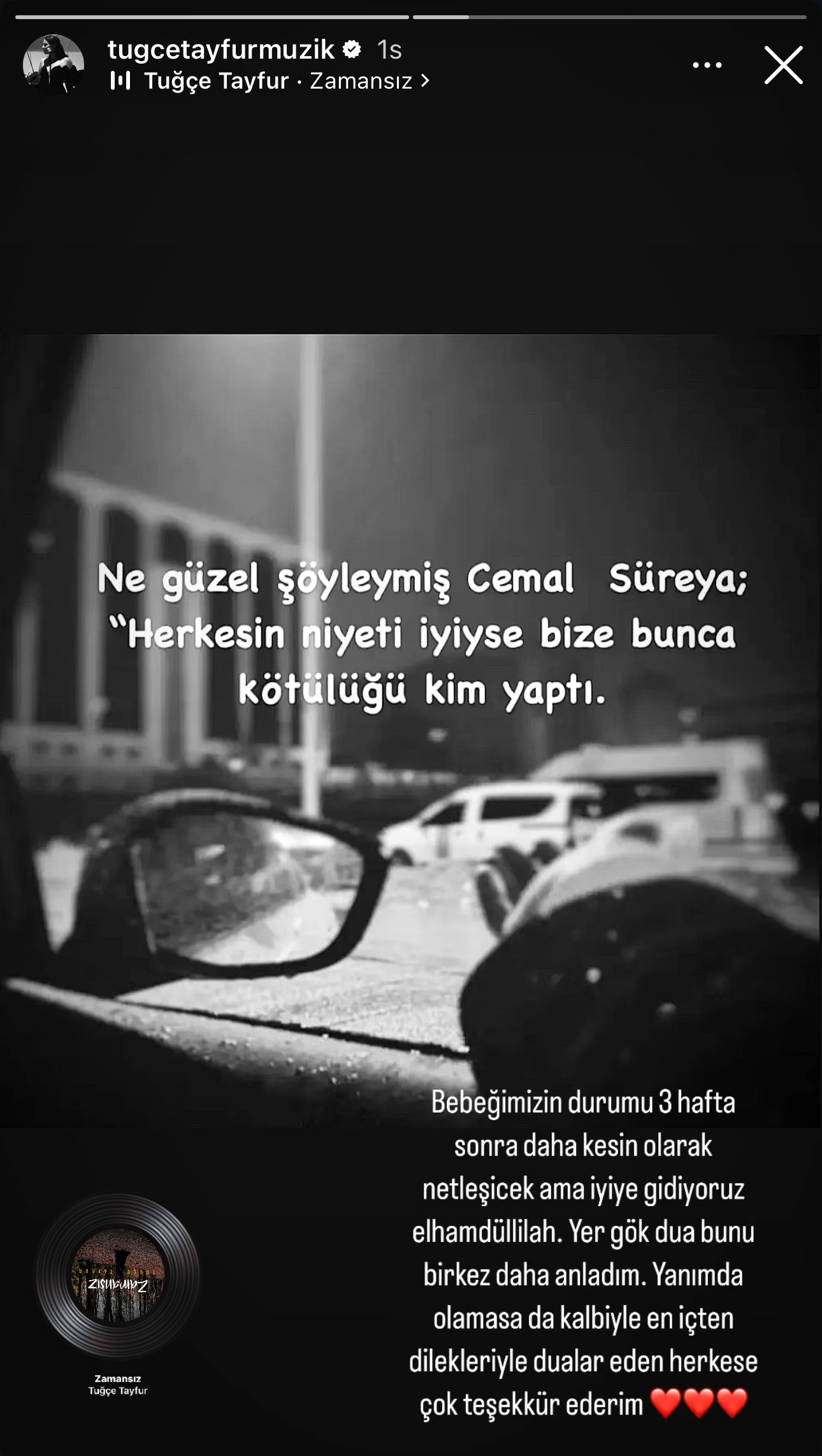 Üçüncü çocuğuna hamile olan Tayfur, yeni bir paylaşım yaparak, “Bebeğimizin durumu 3 hafta sonra kesin olarak netleşecek ama iyiye gidiyoruz elhamdülillah. Yer gök dua bunu bir kez daha anladım. Yanımda olamasa da kalbiyle en içten dilekleriyle dualar eden herkese çok teşekkür ederim.” ifadelerini kullandı.