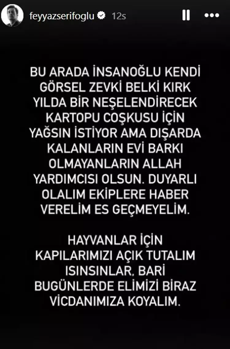 Feyyaz Şerifoğlu, paylaşımında şu ifadelere yer verdi: “Bu arada insanoğlu kendi görsel zevki belki kırk yılda bir neşelendirecek kartopu coşkusu için yağsın istiyor ama dışarıda kalanların, evi barkı olmayanların Allah, yardımcısı olsun.”