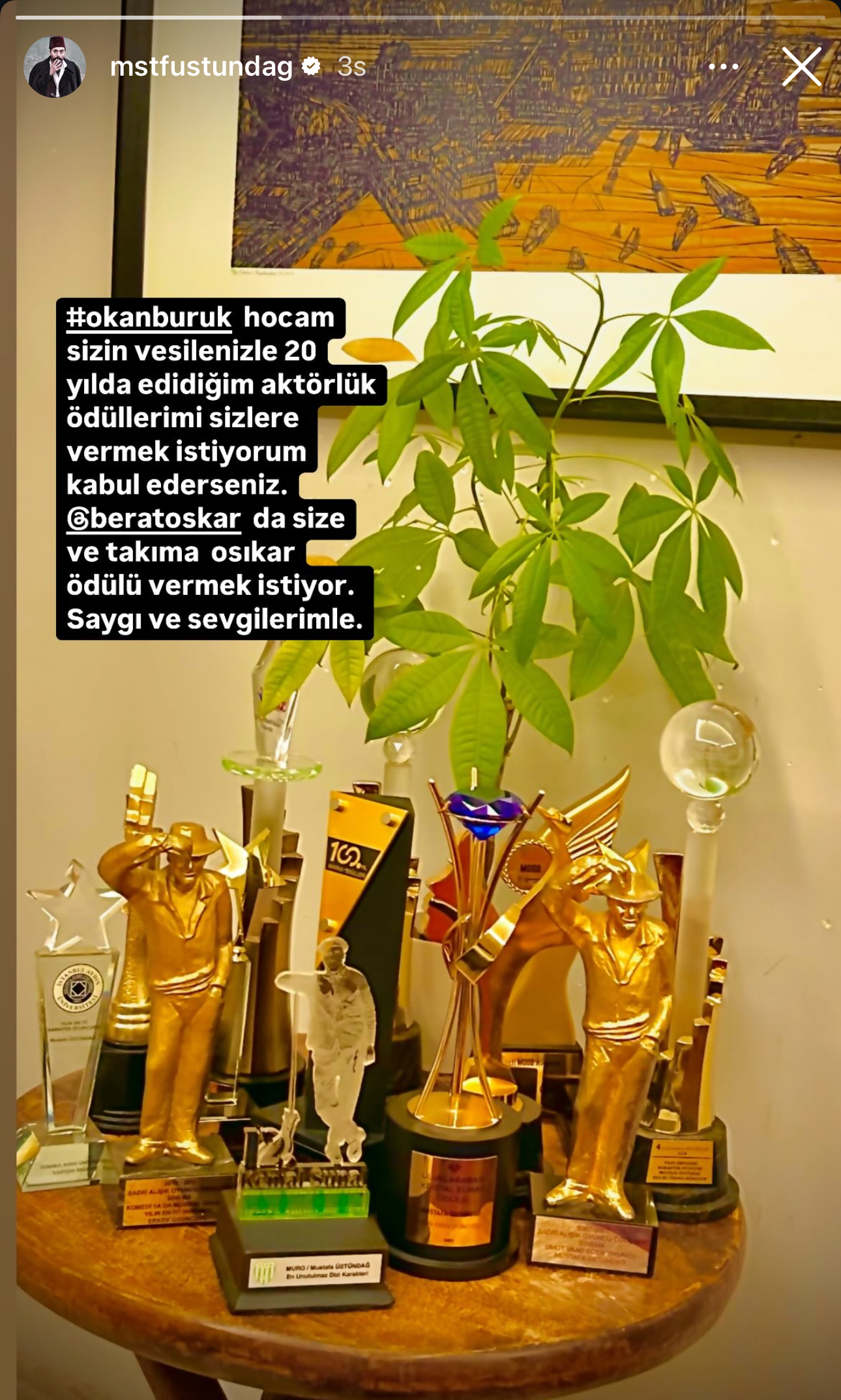 “Okan Buruk hocam, sizin vesilenizle 20 yılda edindiğim aktörlük ödüllerimi sizlere vermek istiyorum, kabul ederseniz. Oskar Gültaşlı da size ve takıma Oscar ödülü vermek istiyor. Saygı ve sevgilerimle.”