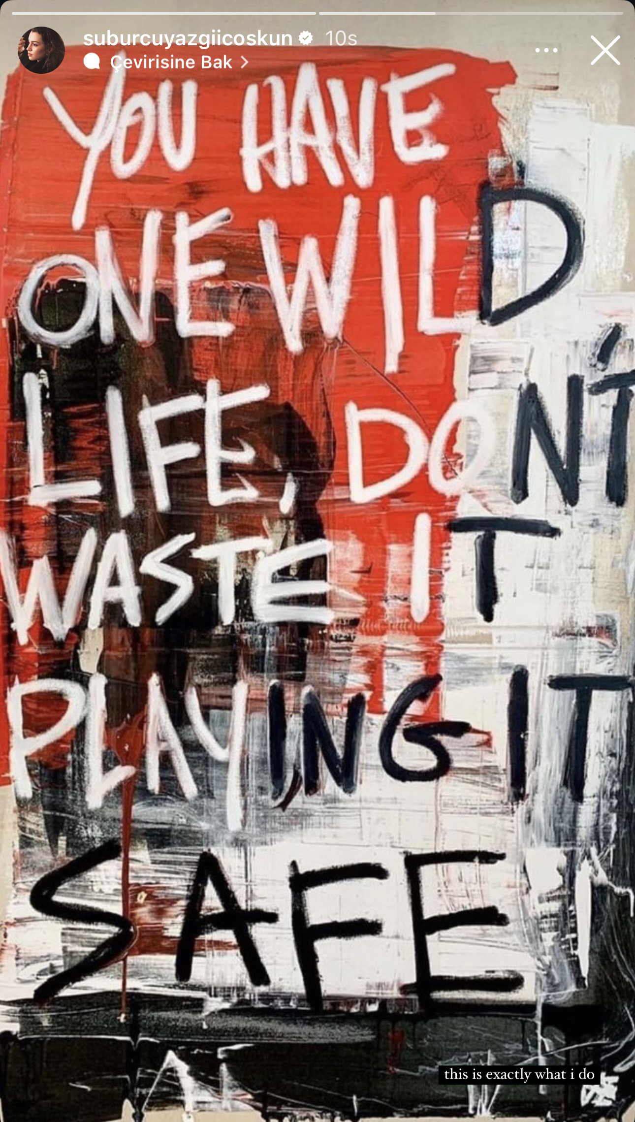 Sosyal medyada en çok konuşulan oyuncular arasında yer alan Su Burcu Yazgı Coşkun, “You have one wild life don’t waste it playing it safe.” yazısını “This is exactly what I do.” notuyla yayınladı. Türkçesi “Tek bir vahşi yaşamınız var, onu da güvenli oynayarak harcamayın” olan yazıya düştüğü notta genç oyuncu, “Ben de tam olarak bunu yapıyorum” dedi.