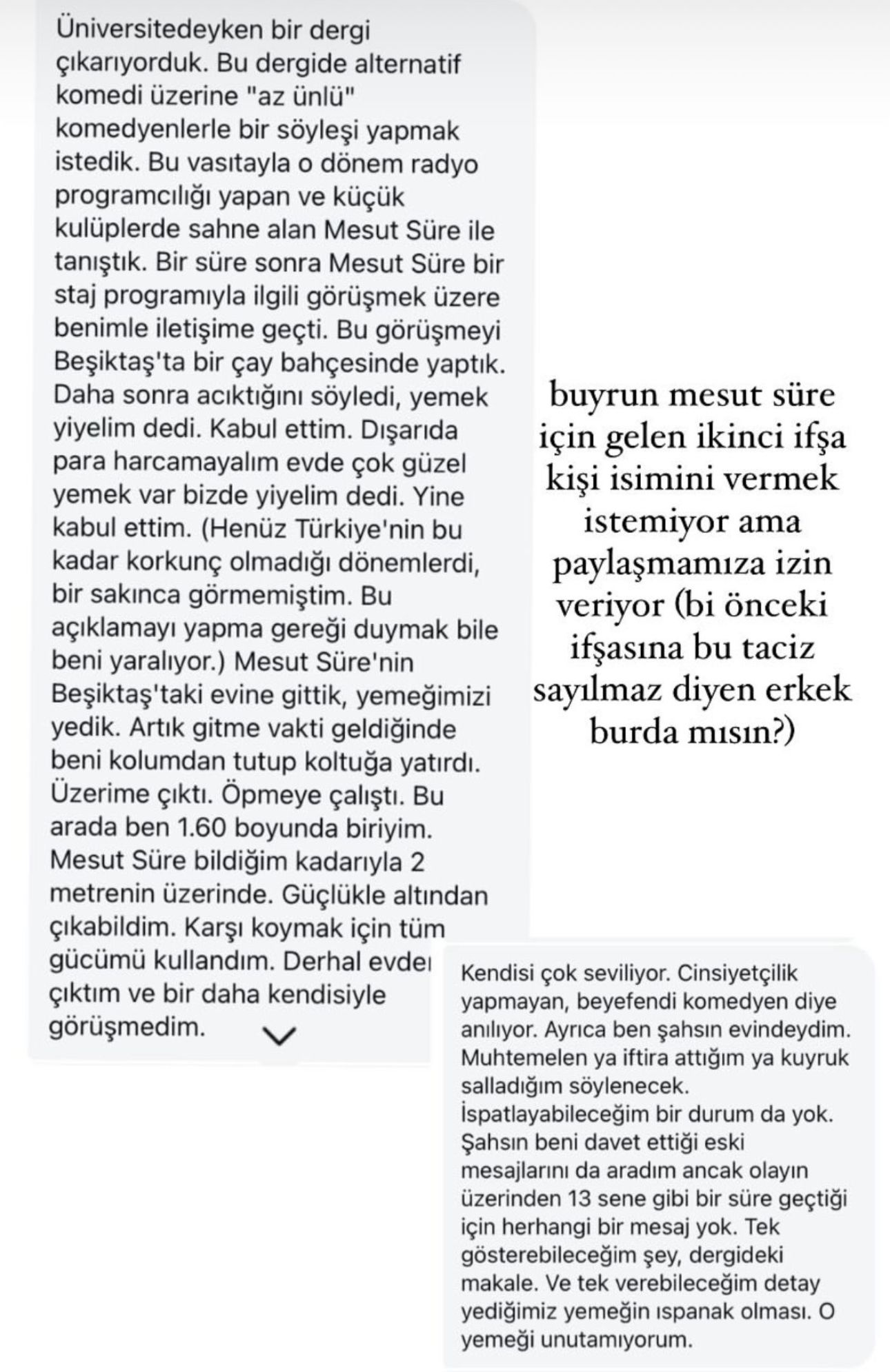 “Üniversitedeyken bir dergi çıkarıyorduk. Bu dergide alternatif komedi üzerine “az ünlü” komedyenlerle bir söyleşi yapmak istedik. Bu vasıtayla o dönem radyo programcılığı yapan ve küçük kulüplerde sahne alan Mesut Süre ile tanıştık. Bir süre sonra Mesut Süre bir staj programıyla ilgili görüşmek üzere benimle iletişime geçti. Bu görüşmeyi Beşiktaş’ta bir çay bahçesinde yaptık. Daha sonra acıktığını söyledi, yemek yiyelim dedi. Kabul ettim. Dışarıda para harcamayalım evde çok güzel yemek var bizde yiyelim dedi. Yine kabul ettim. (Henüz Türkiye’nin bu kadar korkunç olmadığı dönemlerdi, bir sakınca görmemiştim. Bu açıklamayı yapma gereği duymak bile beni yaralıyor.) Mesut Süre’nin Beşiktaş’taki evine gittik, yemeğimizi yedik. Artık gitme vakti geldiğinde beni kolumdan tutup koltuğa yatırdı. Üzerime çıktı. Öpmeye çalıştı. Bu arada ben 1.60 boyunda biriyim. Mesut Süre bildiğim kadarıyla 2 metrenin üzerinde. Güçlükle altından çıkabildim. Karşı koymak için tüm gücümü kullandım. Derhal evdeı çıktım ve bir daha kendisiyle görüşmedim.